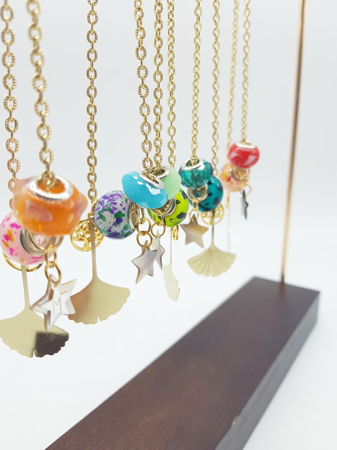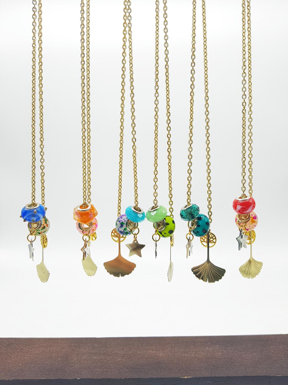 collana girocollo cm 40, catenella argento 925 color oro con rondelle di vetro veneziano colorate, ciondolo in ottone a foglia di Ginkgo, charms a stella con iniziale personalizzata e stella in madreperla.
